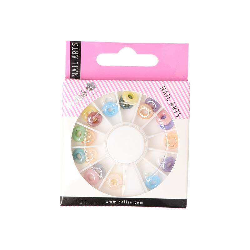 Esta rueda de decoración contiene pequeñas rosquillas de colores ideales para dar a tus uñas un