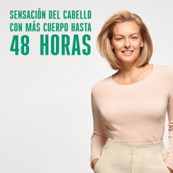 Su fórmula ligera mejora la fuerza interna del cabello y crea una sensación de más cuerpo.