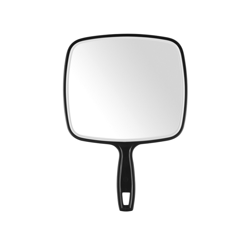 Espejo con mango de plástico en color negro de 22,5 cms de ancho por 32 cms de alto.