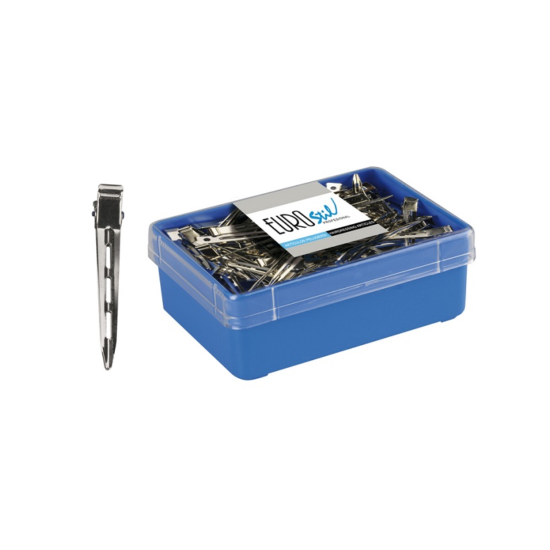 Caja 120 pinzas metálicas para sujetar rulos. Largo: 6,5 cms.