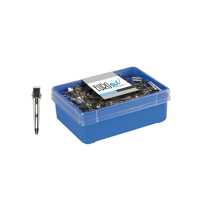 Caja 120 pinzas metálicas para sujetar rulos. Largo: 5,6 cms.