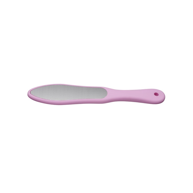 Raspacallos metálico pedicura con mango de goma soft rosa.